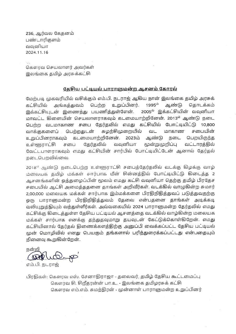 2024 ஆம் ஆண்டு நாடாளுமன்ற தேர்தலில் தமது கட்சிக்கு கிடைத்துள்ள தேசிய பட்டியல் ஆசனத்தை வடக்கில் வாழ்கின்ற மலையக மக்கள் சார்பாக தனக்கு தந்து உதவுமாறு இலங்கை தமிழரசுக் கட்சியின் உறுப்பினர் எம்.பி நடராஜ் அந்த கட்சியின் செயலாளருக்கு கடிதம் எழுதியுள்ளார்.
