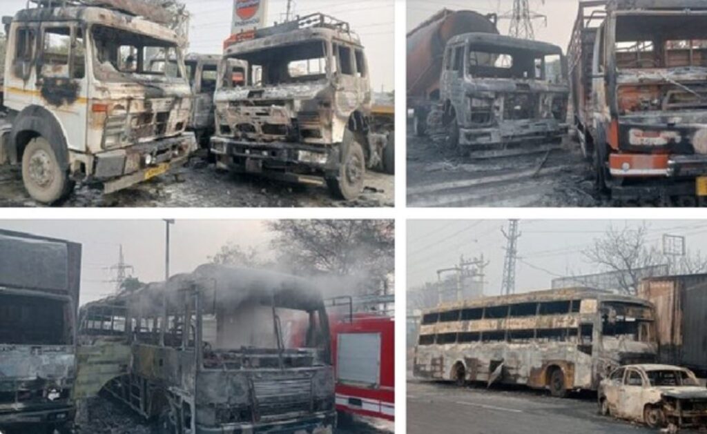 இதனால் சில மீட்டர் தொலைவில் இருந்த லாரி பேருந்து உட்பட 40-க்கும் மேற்பட்ட வாகனங்கள் தீப்பிடித்து எரிந்தன.