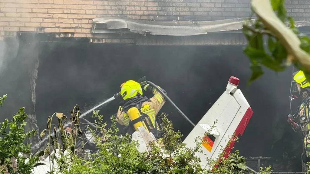 நெதர்லாந்து எல்லை அருகே கொர்சன்பரிச் பகுதியில் நடுவானில் பறந்துகொண்டிருந்தபோது விமானியின் கட்டுப்பாட்டை இழந்த விமானம் வீட்டின்மீது மோதி விபத்துக்குள்ளானது. இதில், விமானம் தீப்பற்றி எரிந்தது.