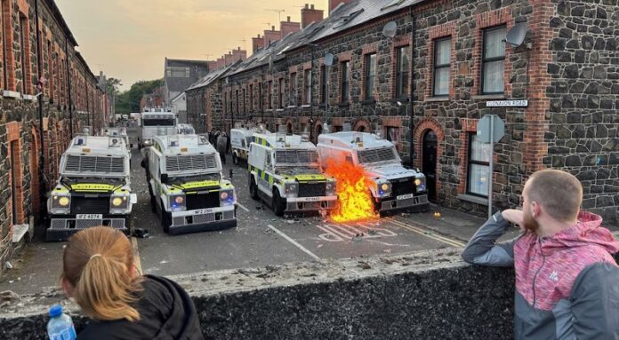 பெல்ஃபாஸ்டுக்கு வடக்கே 25 மைல் (40 கிமீ) தொலைவில் உள்ள நகரில் நூற்றுக்கணக்கான மக்கள் கூடியிருந்த கூட்டத்தை கலைக்கும் முயற்சியில் போலீசார் தண்ணீர் பீரங்கி மற்றும் பிளாஸ்டிக் தடியடி குண்டுகளைப் பயன்படுத்தியுள்ளனர்.