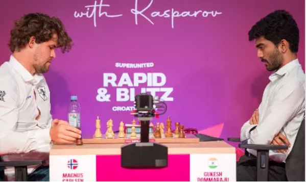 இந்திய இளம் கிராண்ட் மாஸ்டரும் உலக சாம்பியனுமான டி.குகேஷ் குரோஷியாவில் நடைபெற்று வரும் கிராண்ட் செஸ் டூர் சூப்பர் யுனைடெட் ரேபிட் 2025 போட்டியில் கார்ல்சனை வீழ்த்தி அசத்தலான வெற்றியைப் பெற்றார்.