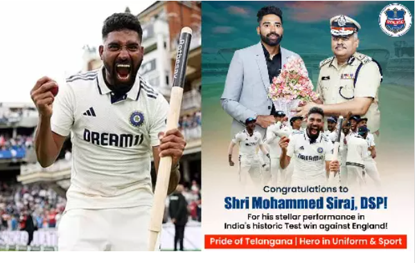 இந்நிலையில் இங்கிலாந்துக்கு எதிரான 5-வது டெஸ்ட் போட்டியில் இந்தியாவின் வெற்றிக்கு முக்கிய காரணமாக இருந்த சிராஜை தெலங்கானா காவல்துறை பாராட்டி போஸ்டர் வெளியிட்டுள்ளது. இது தொடர்பான புகைப்படம் சமூக வலைதளங்களில் வைரலாகி வருகிறது.