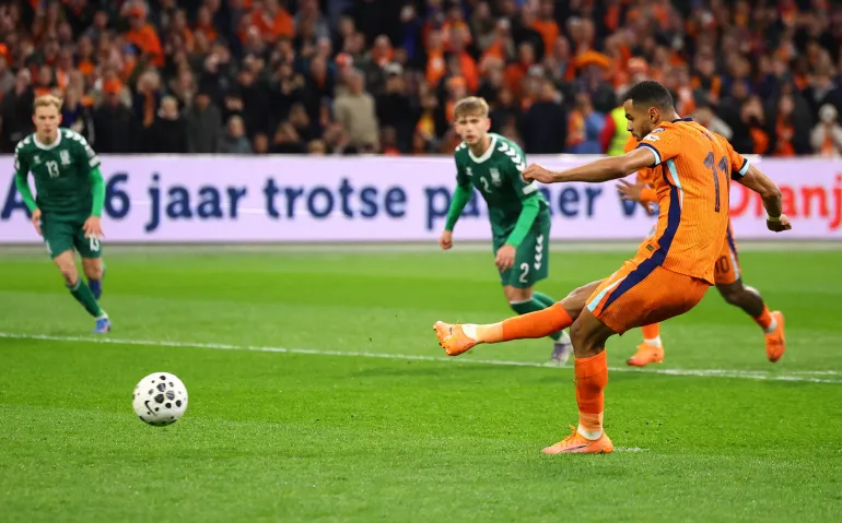 Netherlands’ Cody Gakpo scores his side’s second goal from the penalty spot against Lithuania in their World Cup UEFA Qualifier, Group G match at Johan Cruijff Arena, Amsterdam, the Netherlands, on November 17, 2025 [Piroschka Van De Wouw/Reuters]