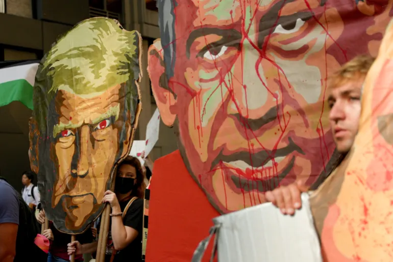 People carry caricature heads of US President Donald Trump, left, and Israeli Prime Minister Benjamin Netanyahu as they march during a pro-Palestinian protest, September 26, 2025, New York, US [Angelina Katsanis/AP Photo]