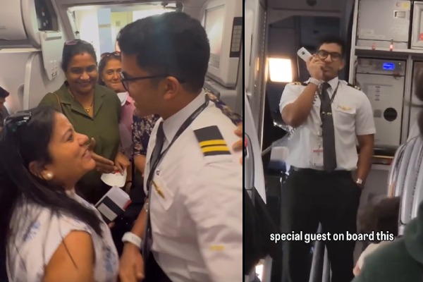 குறித்த காணொளியில், விமானி தனது தாயை அன்புடன் அணைத்து, பின்னர் பயணிகளுக்கு ஒரு நெகிழ்ச்சியான அறிவிப்பை வெளியிடுகின்றார்.