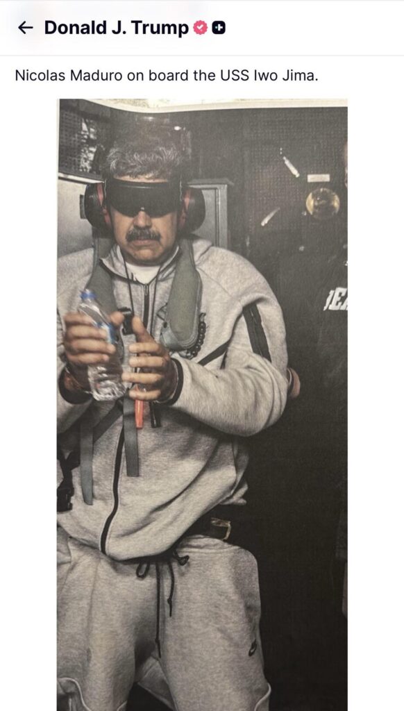 சனிக்கிழமை இரவு மின்னல் வேகப் படை நடவடிக்கையில் கைதுசெய்யப்பட்ட வெனிசுலா ஜனாதிபதி நிக்கோலஸ் மடூரோ கண்கள் மறைக்கப்பட்டு கைவிலங்குடன் தோன்றும் படம் ஒன்றை அமெரிக்க அதிபர் ட்ரம்ப் தனது “ருத் சோஷல்” சமூக ஊடகத்தில் வெளியிட்டிருக்கிறார்.