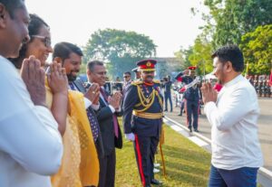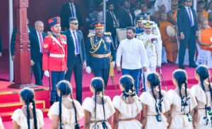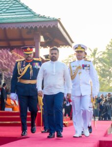 தேசிய கீதம் இசைக்கப்பட்ட பின்னர் முப்படைகளின் தளபதிகள் மற்றும் பொலிஸ் மா அதிபர் சட்டத்தரணி பிரியந்த வீரசூரிய ஆகியோர் இணைந்து ஜனாதிபதி அநுரகுமார திஸாநாயக்கவை விசேட மேடைக்கு அழைத்துச் சென்றனர்.