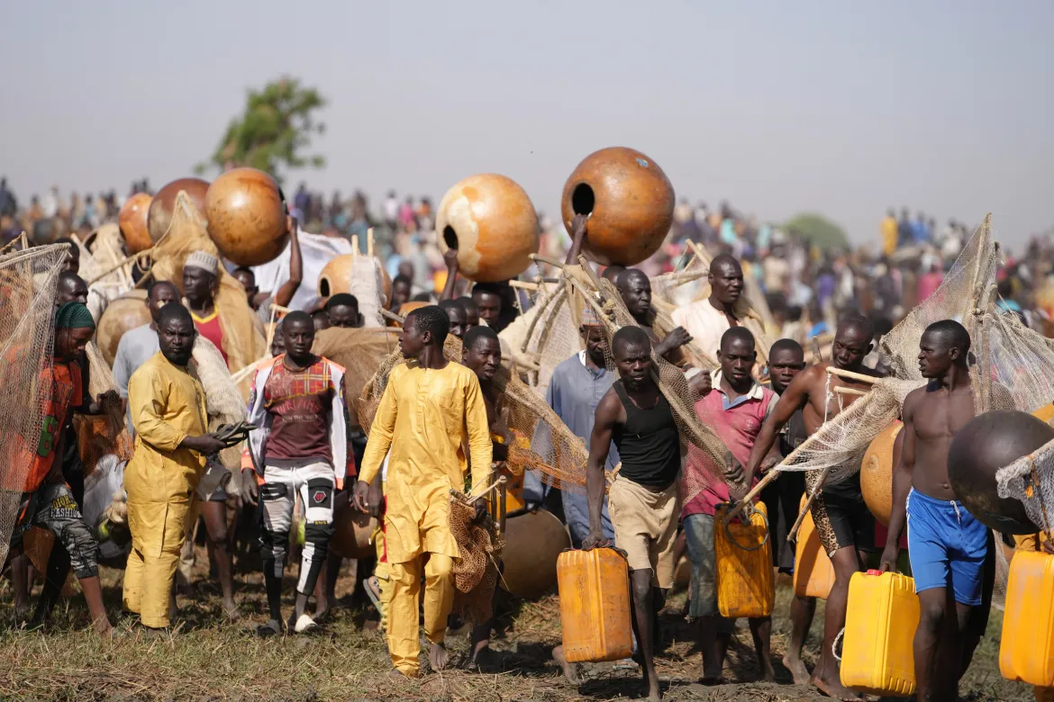 Fishermen drifted atop spherical brown gourds across the Matan Fada river, using nothing but their bare hands and nets to pursue prized catches in the cloudy depths. Thousands of spectators crowded along the riverbank, erupting in enthusiastic cheers. [Sunday Alamba/AP Photo]