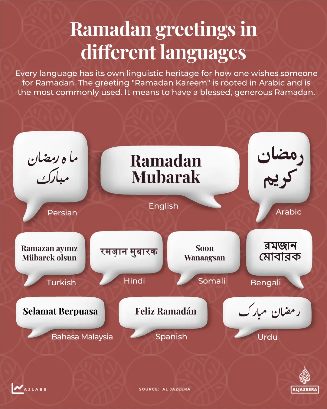 Various Muslim-majority nations have a personalised greeting in their native languages. “Ramadan Mubarak” and “Ramadan Kareem” are common greetings exchanged over the month, wishing the recipient a blessed and generous month, respectively.