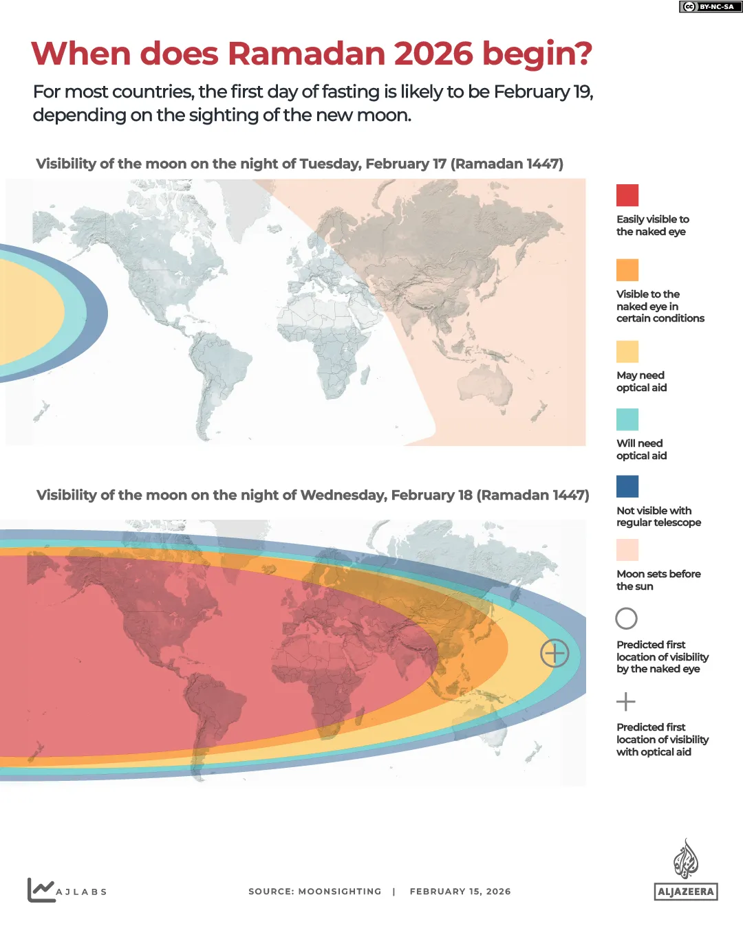 According to Crescent Moon Watch, a moon tracker run by the United Kingdom’s Nautical Almanac Office, Ramadan’s new moon will begin on February 17 at 3:01pm Mecca time (12:01 GMT).