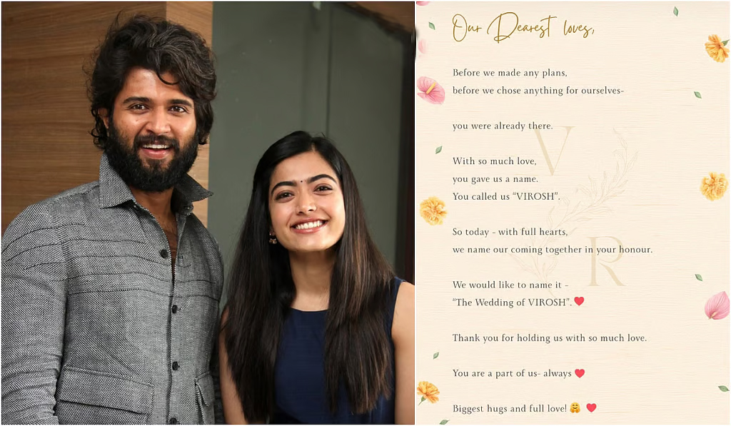 ரசிகர்களுக்காக அக்கடிதத்தை வெளியிட்டுள்ளனர். அதில் விஜய் தேவரகொண்டா – ராஷ்மிகா ஜோடி, “நாங்கள் எந்தத் திட்டத்தையும் வகுப்பதற்கு முன்பும், எங்களுக்காக எதையும் தேர்ந்தெடுப்பதற்கு முன்பும் நீங்கள் ஏற்கனவே அங்கே உள்ளீர்கள். மிகுந்த அன்புடன் நீங்கள் எங்களுக்கு விரோஷ் (ViRosh) என்று பெயரிட்டீர்கள்.